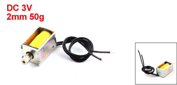 Product Name DC Solenoid Electromagnet Coil Voltage DC 3V Action Form Pull Type Rated Stroke & Force 2mm, 50g Connection Rate 50% Body Size 20.5 x 12 x 11mm / 1" x 0.47" x 0.43" (L*W*H) Cable Length 15cm / 6" Plunger Dia. 4mm / 0.16" Material Metal, Electronic Parts Net Weight 15g Package Content 1 x DC Solenoid Electromagnet - Reviews