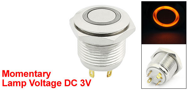 Item Name Push Button Switch Action Type Momentary Type LED Type Ring-Illuminated LED Head Shape Flat Head Contact SPDT(1NO 1NC ) Switch Rating 250VAC 5A Lamp Voltage DC 3V LED Color Yellow Pin Number 4 Thread Diameter 16mm/0.6" Total Size 22 x 19mm/0.87" x 0.75" (L*Max.W) Material Metal, Plastic, Electric Parts Housing Color Silver Tone Weight 13g Package Content 1 x Push Button Switch - Reviews