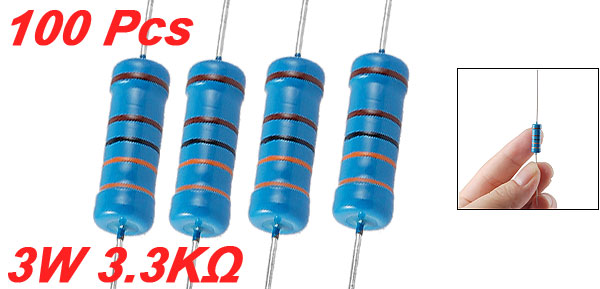 Product Name Metal Film Resistor Rated Power 3W Tolerance ± 1% Resistance Value 3.3KΩ T.C.R(Temperature Coefficient) ±50ppm/°C Body Size 5 x 16mm/0.2" x 0.61" (D*L) Leads Dia (Approx.) 0.5mm/0.019" Total Length (Approx.) 79mm/3.1" Color As Picture Shown Net Weight 144g Package Content 100 Pcs (± 2%) x Metal Film Resistors - Reviews
