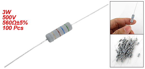 Product Name Resistors Type Metal Oxide Film Power Rating 3W Resistance Tolerance ± 5% Withstand Voltage 500V Resistance 560Ω Lead Diameter 0.5mm / 0.019" Each Size (Approx.) 80 x 5.7mm/ 3.1" x 0.224" (L*D) Color As Picture Show Weight 145g Package Content 100(±2%) x Metal Oxide Film Resistors - Reviews
