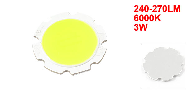 Product Name COB LED Light Rated Voltage 10-12V Luminous Flux 240-270LM Color Temperature 6000K Power 3W Work Current 700mA Material Plastic, Aluminum Total Emitters 1 Color White, Yellow Size 28 x 2mm/ 1.1" x 0.08" (L*W) Light Color White Weight 3g Package Content 1 x COB LED Light - Reviews