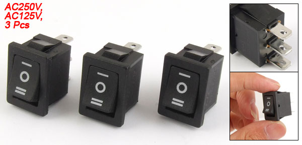 Item Name Rocker Switch Type On/ Off/On (SPDT) Voltage & Current AC250V, 6A AC125V, 10A Each Size ~2 x 1.5 x 2.5cm / 0.8" x 0.6" x 1"(L*W*H) Mount Hole Size 1.85 x 1.25cm / 0.73" x 0.49"(L*W) Color Black Material Plastic & Metal Total Weight 14g Package Content 3 x Rocker Switch - Reviews