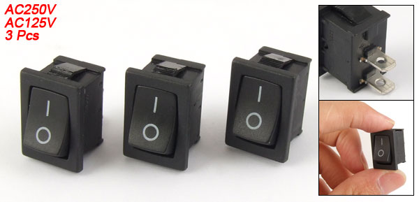 Item Name Rocker Switch Type On/ Off (SPST) Voltage & Current AC250V, 6A AC125V, 10A Each Size ~2.1 x 1.5 x 2.2cm / 0.8" x 0.6" x 0.9"(L*W*H) Mount Hole Size ~1.85 x 1.15cm / 0.73" x 0.45"(L*W) Color Black Material Plastic & Metal Total Weight 11g Package Content 3 x Rocker Switch - Reviews