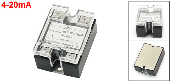 Product Name Solid State Relay Model SSR-25LA Control 4-20mA Output AC 28-280V 25A Screw Terminal 4 Phase Single Fixing Hole Dia 4.5mm/0.14" Fixing Center Distance 48mm/2" Size (Approx.) 59 x 45x 32mm/ 2.4" x 1.8" x 1.3"(L*W*T)