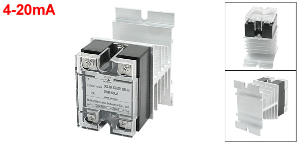 Product Name Solid State Relay w Heatsink Model No. SSR-50LA Control Resistance 4-20mA Output Voltage AC 28-280V 50A Phase Single Phase Screw Terminal 4 Fixing Hole Dia 5mm/0.2" Fixing Hole Center Distance 7.3cm/2.8" Relay Size (Approx.) 5.8 x 5 x 3.3cm/2.3" x 2" x 1.3"(L*W*H) Total Size 8 x 5 x 8.3cm/3.1" x 2" x 3.2"(L*W*H) Heatsink Material Aluminum, Plastic Color Clear, Black, Silver Tone Weight 181g Package Content 1 x Solid State Relay w Heatsink - Reviews