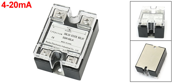 Product Name Solid State Relay Model SSR-50LA Control 4-20mA Output AC 28-280V 50A Screw Terminal 4 Phase Single Fixing Hole Dia 4.5mm/0.14" Fixing Center Distance 48mm/2" Size (Approx.) 59 x 45x 32mm/ 2.4" x 1.8" x 1.3"(L*W*T)