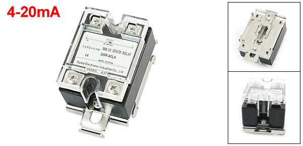 Product Name Solid State Relay Model SSR-40LA Control 4-20mA Output AC 28-280V 40A Screw Terminal 4 Phase Single Mounting Type 35mm DIN Rail Mounting Relay Size 58 x 45 x 32mm/ 2.3" x 1.8" x 1.3"(L*W*T) Spring Leagth 21mm/0.83" Total Size (Approx.) 80.5 x 46.5 x 45mm/3.1" x 1.8" x 1.8"(L*W*T)