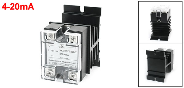 Product Name Solid State Relay w Heatsink Model No. SSR-40LA Control Resistance 4-20mA Output Voltage AC 28-280V 40A Phase Single Phase Screw Terminal 4 Fixing Hole Dia 5mm/0.2" Fixing Hole Center Distance 7.3cm/2.8" Relay Size (Approx.) 5.8 x 4.5 x 3.3cm/2.3" x 1.8" x 1.3"(L*W*H) Total Size 8 x 5 x 8.5cm/3.1" x 2" x 3.3"(L*W*H) Heatsink Material Aluminum, Plastic Color Clear, Black Weight 182g Package Content 1 x Solid State Relay w Heatsink - Reviews