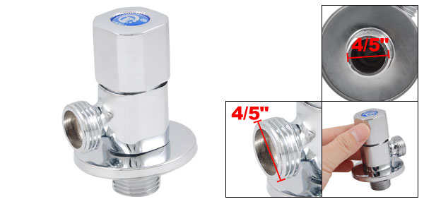 Product Name Angle Stop Valve Material Chrome Finish, Solid Brass Male Thread Diameter 20.5 x 20.5mm / 4/5" x 4/5" Overall Size (Approx.) 7.5 x 2.7 x 4cm / 3" x 1" x 1.6" (L*W*H) Color Silver Tone Weight 142g Package Content 1 x Angle Stop Valve 1 x Round Disc - Reviews