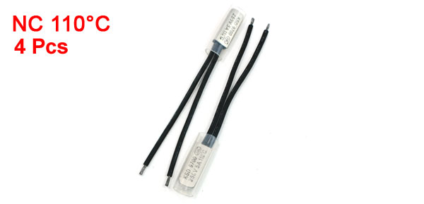 Rated Power 250V 5A Active Temperature 110°C Lead Wire Length 7.3cm / 2.9" Head Dimension 20 x 7.5 x 3.5mm/0.78" x 0.3" x 0.14"(L*W*T) Material Bimetal ,Plastic,Stainless Steel Main Color Silver Tone, Black Net Weight 14g Package Content 4PCS x Temperature Control Switch - Reviews