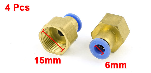 Item Name Quick Fitting Total Size 25 x 19mm/ 1" x 0.8" (H*W) Female Thread Dia. 15mm/ 0.6" Push in Pipe Dia(Blue End) 6mm/ 0.24" Main Material Metal, Plastic Color Brass Tone, Blue Weight 77g Package Content 4 x Quick Fittings - Reviews