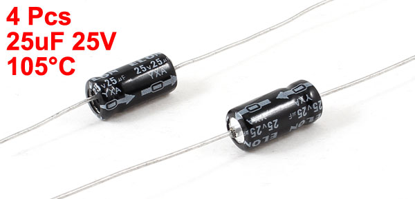 Product Name Electrolytic Capacitor Type Axial Lead Features Standard General Purpose Maximum Temperature 105°C Withstand Voltage 25V Capacitance 25uF Body Size 6 x 11mm / 0.24" x 0.43" (D*L) Lead Length 39mm/ 1.5'', 45mm/ 1.7" Dielectric Material Aluminum Weight 4g Color As Picture Shown Package Content 4 Pcs x Electrolytic Capacitors - Reviews