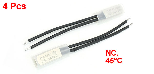 Rated Power 250V 5A Active Temperature 45°C Lead Wire Length 7.3cm / 2.9" Head Dimension 20 x 7.5 x 3.5mm/0.78" x 0.3" x 0.14"(L*W*T) Material Bimetal ,Plastic,Stainless Steel Main Color Silver Tone, Black Net Weight 15g Package Content 4 PCS x Temperature Control Switch - Reviews