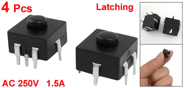 Product Name Torch Push Button Switch Contact Type Latching Contact Voltage/ Current AC 250V 1.5A Pin Number 7(Four Side) Terminal Driection Vertical Overall Size(No Include Pin) 12 x 12 x 9mm/ 0.47" x 0.47" x 0.35" (L*W*H) Button Diameter 5mm/ 0.2" Material Plastic, Metal, Electric Parts Color Black, Silver Tone Net Weight 5g Package Content 4 x Torch Push Button Switch - Reviews