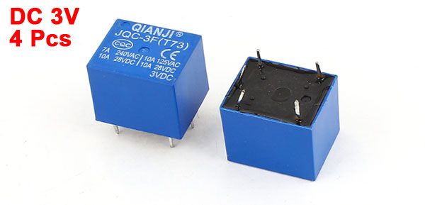 Product Name Power Relay Model JQC-3F(T73) Rated Load AC 7A/240V, DC 10A/28V, AC 10A/125V Coil Voltage DC 3V Switch Type SPST Size 19 x 19 x 15mm / 0.75" x 0.75" x 0.6"(L*W*H) Pin Quantity 5Pin Color Blue Weight 30g Package Content 4 x Power Relays - Reviews