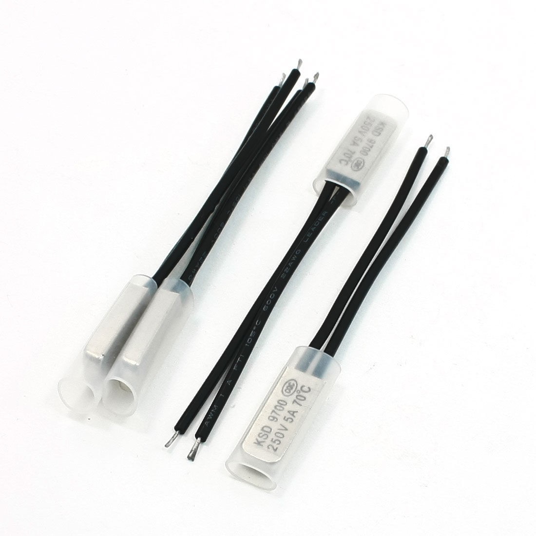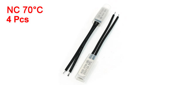 Rated Power 250V 5A Active Temperature 70°C Lead Wire Length 7.3cm / 2.9" Head Dimension 20 x 7.5 x 3.5mm/0.78" x 0.3" x 0.14"(L*W*T) Material Bimetal ,Plastic,Stainless Steel Main Color Silver Tone, Black Net Weight 13g Package Content 4 PCS x Temperature Control Switch - Reviews