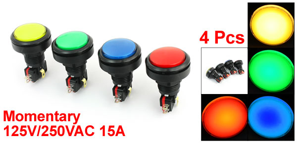 Product Name Arcade Push Button Switch Contact Type Momentary Action Type SPDT Light Color Red, Green,Yellow, Blue Rated 125V/250VAC 15A
