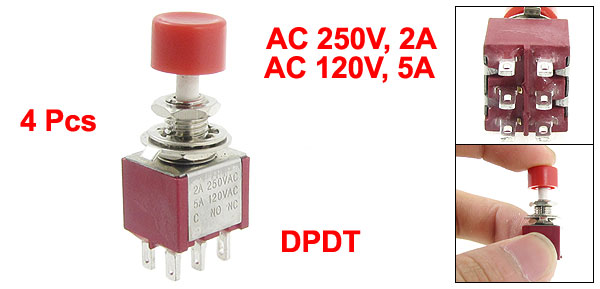 Contact Type 2NO+2NC Action Type Momentary Type DPDT Cap Diameter 9.7mm / 0.38" Mounting Hole Diameter 6mm / 0.236" Body Size(Approx.) 13 x 11.5 x 11.5mm / 0.5" x 0.45" x 0.45"(L*W*T) Total Height 34mm / 1.3" Material Plastic, Metal Weight 25g Package Content 4 Pcs x Push Button Switch - Reviews