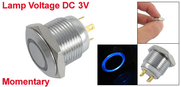 Item Name Metal Push Button Switch Operation Type Momentary Type Head Shape Flat Round Contact 1NO Lamp Voltage DC 3V Operation Pressure 4N Switch Rating AC 250V 3A Pin Number 4 LED Color Blue Button Diameter 11mm/0.4'' Thread Diameter 16mm/0.6'' Total Size 22 x 21mm/0.8'' x 0.8'' (L*Max.W) Material Metal, Electric Parts Housing Color Silver Tone Net Weight 13g Package Content 1 x Metal Push Button Switch  - Reviews