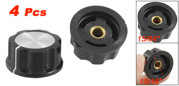 Product Name Rotary Knob Material Plastic, Metal Color Black, Silver Tone Shaft Hole Dia. 6mm/ 15/64" Knob Inner Dia 24mm/ 15/16" Overall Size 33 x 15mm/ 1.3" x 0.6"(D*H) Weight 48g Package Included 4 x Rotary Knob - Reviews