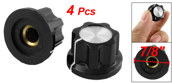 Product Name Potentiometer Knob Cap Material Plastic, Metal Color Silver Tone, Black Shaft Hole Dia. 6mm/ 15/64" Knob Dia 18.5mm/ 3/4" Overall Size 23 x 13mm/ 7/8" x 1/2"(D*H) Weight 24g Package Included 4 x Potentiometer Knob - Reviews