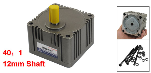 Product Name Gear Head Model 5GN-40K Reduction Ratio 40:1 Shaft Diameter 12mm/ 0.47" Base Hole Diameter 12mm/ 0.47" Mount Hole Diameter 6.5mm/ 0.26" Mount Hole Distance 75 x 75mm/ 2.95" x 2.95"(L*W)(Center to Center) Body Size 89 x 89 x 59mm/ 3.5" x 3.5" x 2.32" (L*W*H) Total Size 89 x 89 x 95mm/ 3.5" x 3.5" x 3.74" (L*W*H) Material Metal Color Gray Net Wieght 1141g Package Content 1 x Gear Head