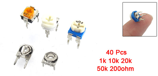 Product Name Adjustable Resistors Resistance 1k, 5K, 10K, 20K, 50K 200Ohm Dimension 1K: 6.6 x 6 x 6mm/ 0.26" x 0.23" x 0.23" (L*W*H) 10K: 7 x 6.6 x 10mm/ 0.27" x 0.26" x 0.39" (L*W*H) 20K: 7.8 x 7 x 11mm/ 0.3" x 0.27" x 0.43" (L*W*H) 50K: 7 x 5 x 11.5mm/ 0.3" x 0.27" x 0.45" (L*W*H) Color As Picture Show Weight 12g Package Content 40 x Adjustable Resistors - Reviews