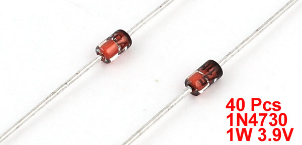 Product Name Zener Diodes Model 1N4730 Package type DO-41 Type Axial Lead Rating Voltage 3.9V Power 1W Overall Size 65 x 2mm/2.6" x 0.08"(L*D) Weight 10g Package Content 40 x Zener Diodes - Reviews