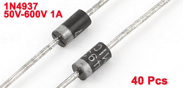 Product Name Rectifier Diodes Model 1N4937 Package Type DO-41 Reverse Voltage 50-600V Forward Current 1 A Body Size 6 x 3mm / 0.24" x 0.12"(L*D) Total Length 60mm / 2.4" Color Black, Silver Tone Weight 14g Package Content 40 x Rectifier Diodes - Reviews