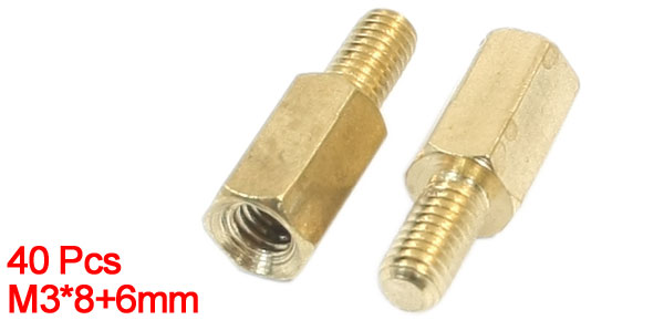 Product Name Standoff Hexagonal Spacer Thread Size M3 Male to Female Male Thread Length 6mm Body Length 8mm Overall Size(Approx) 14 x 5mm / 0.57" x 0.2" (L*Max.D) Material Brass Color Gold Tone Net Weight 48g Package Content 40Pcs x Standoff Hexagonal Spacer - Reviews