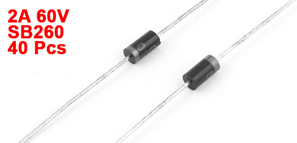 Product Name Rectifier Diodes Model SB260 Package Type DO-15 Maximum Repetitive Peak Reverse Voltage 60V Maximum Average Forward Rectified Current 2A Body Size 6 x 3mm / 0.24" x 0.12"(L*D) Length 60mm / 2.4" Color Black, Silver Tone Weight 9g Package Content 40 x Rectifier Diodes - Reviews
