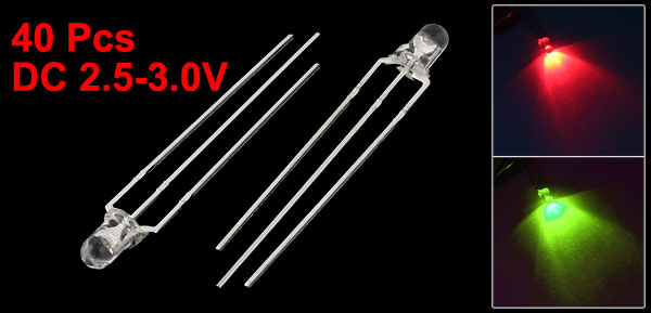 40 Pcs Super Bright 3mm 3Pins Red Green LED Common Cathode Light Emitting Diodes
