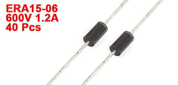 Product Name Fast Recovery Diodes Model ERA15-06 Package Type DO-41 Maximum Repetitive Peak Reverse Voltage 600V Maximum Average Forward Rectified Current 1.2A Body Size 6 x 3mm / 0.24" x 0.12"(L*D) Length 60mm / 2.4" Color Black, Silver Tone Weight 17g Package Content 40 x Fast Recovery Diodes - Reviews