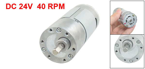 Product Name DC Motor Rated Voltage DC 24V Speed 40 RPM Shaft Size 6 x 14mm/2.3" x 0.6"(D*L) Body Size 37 x 117mm/ 1.45" x 4.6" (D*H) Main Color Silver Tone Material Metal Net Weight 323g Package 1 x DC Motor - Reviews