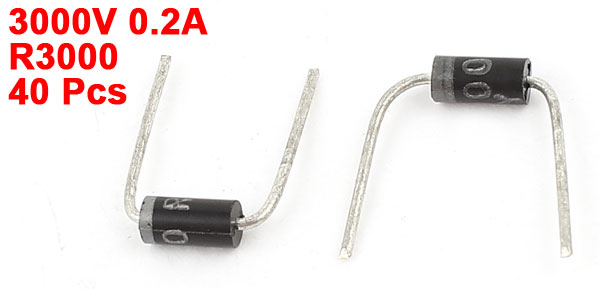 Product Name Rectifier Diodes Model R3000 Package Type DO-15 DC Blocking Voltage 3000V Average Forward Current 200mA Body Size 2 x 5mm / 0.08" x 0.2"(D*L) Color Black Weight 11g Package Content 40 x Rectifier Diodes - Reviews