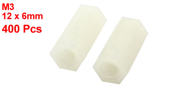 Product Name Hexagonal Threaded Spacer Thread Size M3 Total Size 12 x 6mm / 0.5" x 0.24" (H*D) Material Nylon Color White Net Weight 104g Package Content 400Pcs(± 2%) x Hexagonal Threaded Spacer  - Reviews