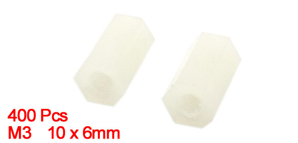 Product Name Hexagonal Threaded Spacer Thread Size M3 Total Size 10 x 6mm / 0.4" x 0.24" (H*D) Material Nylon Color White Net Weight 90g Package Content 400Pcs(± 2%) x Hexagonal Threaded Spacer - Reviews