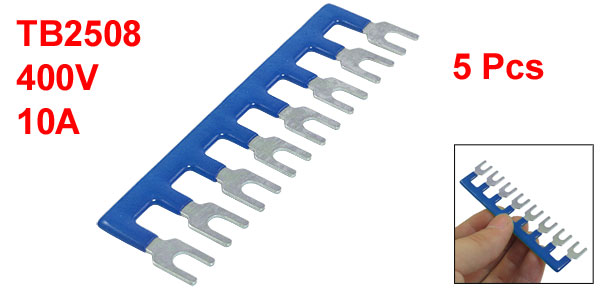 Product Name Terminal Stripe Model TB2508 Rated Value 400V, 10A Positions 8 Design Fork Type Material PVC, Metal Color Silver Tone, Blue Inside Width 4.4mm/0.17" Outside Width 8.1mm/0.31" Pin Pitch 4mm/0.15" Fork Total Width 92mm/ 3.6" Sleeve Total Width 88mm/ 3.5" Total Height 23mm/ 0.9" Weight 43g Package Content 5 x Terminal Stripe  - Reviews