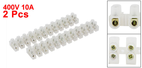 Product Name Plastic Terminal Block Material(external) Plastic , Metal Color Clear Type 12 Postions , 2 Rows Rated Value 400V , 10A Cable Entry Capacity 10mm2 Size 11 x 2 x 1.5cm / 4.3" x 0.8" x 0.6"(L*W*H) Weight 36g Package Content 2 x Plastic Terminal Block - Reviews