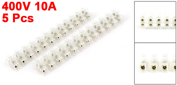 Product Name Plastic Terminal Block Material(external) Plastic , Metal Color Clear Type 12 Postions , 2 Rows Rated Value 400V , 10A Cable Entry Capacity 10mm2 Size 11 x 2 x 1.5cm / 4.3" x 0.8" x 0.6"(L*W*H) Weight 87g Package Content 5 x Plastic Terminal Block  - Reviews