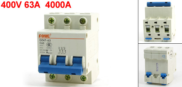 Product Name Circuit Breaker Model DZ47-63 C63 Rated Voltage 400V Rated Current 63A Rated Circuit Breaking Capacity 4000A Frequency 50Hz Mounting Type 35mm DIN Rail Mount Total Size (Approx.) 8 x 7.5 x 5.3cm/3.15" x 3" x 2.1"(L * W * H) Number of Poles 3 Material Plastic, Electric Components Color White, Blue Weight 268g Package Content 1 x Circuit Breaker - Reviews