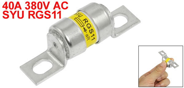 Product Name Bolt Connected Fuse Model SYU RGS11 Type Fast Acting Material Metal Rated Voltage 380V Rated Current 40A Main Color Silver Tone Total Size 56 x 17mm / 2.2" x 0.67" (L*D) Hole Size 8.2 x5.8mm / 0.3"x 0.2" (L*W) Weight 23g Package Content 1 x Bolt Connected Fuse - Reviews