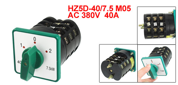 Product Name Combination Switch Model No. HZ5D-40/7.5 M05 Ui AC380V Ith 40A Power 7.5KW Rated Current 20A Positions 1-0-2(ON-OFF/ON) Terminal Number 12 Body Diameter 70mm / 2.7" Overall Size 70 x 70 x 100mm / 2.7" x 2.7" x 4"(L*W*H) Bottom Screw Diameter 4mm / 0.157" External Material Plastic Net Weight 428g Package Content 1 x Combination Switch - Reviews