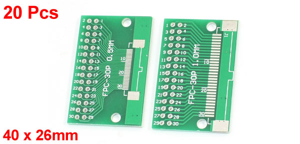Product Name PCB Adapter Plate Type FPC-30P 0.5mm/1mm to 2.54mm Pin Number 30 Pin Pin Pitch 2.54mm Fixing Hole Dia 3.5mm/0.14" Fixing Hole Center Distance 34mm/1.3" Thickness 1.5mm/0.06" Body Size 40 x 26mm/1.6" x 1"(L*W) Material Plastic, Electronic Part Main Color Green Net Weight 70g Package Content 20Pcs x PCB Adapter Plate - Reviews