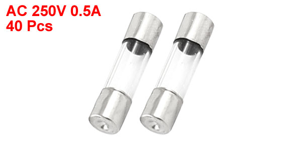 Details40pcs 5x20mm Fast Acting Type Glass Tube Fuses 0.5Amp AC 250V  Product Name Glass Tube Fuses Features Fast Blow Rated Voltage AC 250V Rated Current 0.5A Dimension 5 x 20mm/ 0.2" x 0.8" (D*L) Material Glass, Metal Color Silver Tone, Clear Weight 26g Package 40 x Glass Tube Fuses