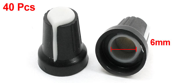 Product Name Potentiometer Control Knob Knob Top Diameter 10mm / 0.39" Knob Base Diameter 14mm /0.56" Shaft Insert Diameter 6mm / 15/64" Knob Total Height 17mm / 0.67" Material Plastic, Metal Main Color Black, White Weight 40g Package Included 40 x Potentiometer Control Knob - Reviews