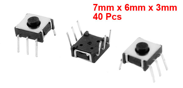 Protduct Name Tact Switch Action Type Momentary Type SPST Pin Number 6 External Material Plastic, Metal Total Size 7 x 6 x 3mm/ 0.28" x 0.24" x 0.12"(L*W*H) Button Diameter 3mm/0.12" Main Color Black, Silver Tone Weight 15g Package 40 Pcs x Tact Switches - Reviews