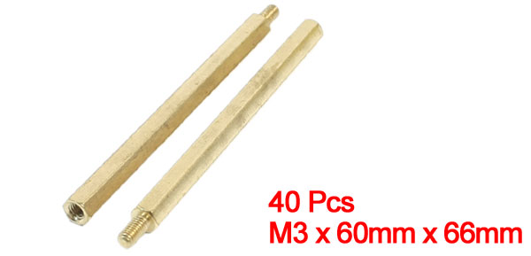 40Pcs M3 x 60mm x 66mm Male Female Thread Brass Hexagonal Standoff Spacer