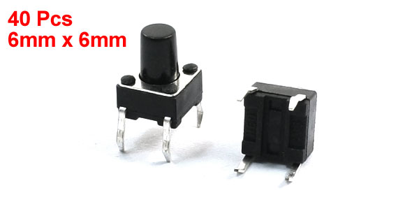 Product Name Tact Switch Action Type Momentary Switch Size 6 x 6mm / 0.23" x 0.23" x 0.21" (W*L) Button Size 4.3 x 3.5mm/ 0.17" x 0.14"(H*D) Pin Spacing 7 x 4mm / 0.27" x 0.15"(L*W) Pin Size 4 x 0.6mm/ 0.16" x 0.02"(L*W) Material Plastic, Metal, Electric Parts Color Black, Silver Tone Net Weight 10g Package Content 40 Pcs x Tact Switches - Reviews