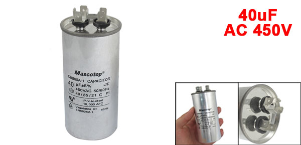 Product Name Motor Capacitor Model CBB65A-1 Housing Material Metal Dielectric Material Metallized Polypropylene Film Capacitance 40uF±5% Rated Voltage AC 450V Frequency 50/60Hz Body Dimension 10.3 x 4.9cm / 4.1"x1.92" (H*D) Color Silver Tone Weight 217g Package Content 1 x Motor Capacitor - Reviews